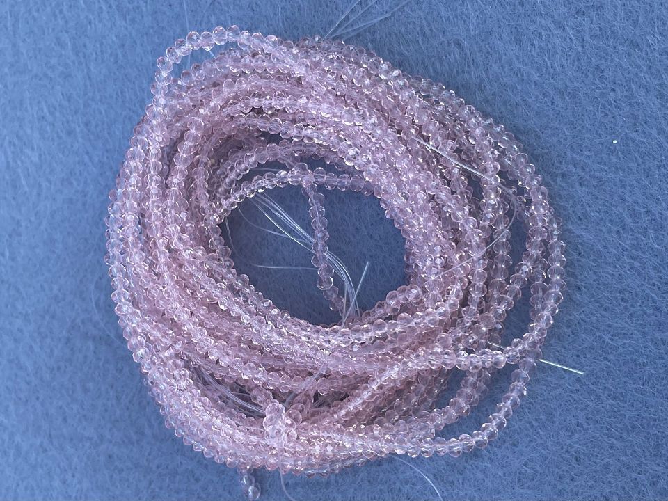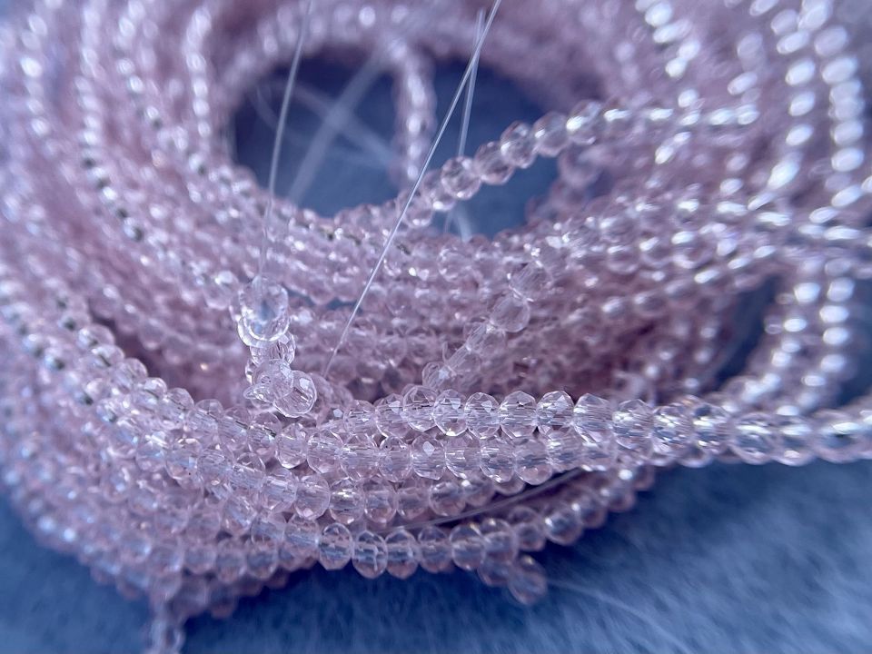 Хрустальные бусины, гранёные. Размер :2*3мм, отверстие : 1 мм. Форма: рондель,сфера . В нитке: 160+-3шт. Цена за 1 нитку. Цвет- светло розовый.