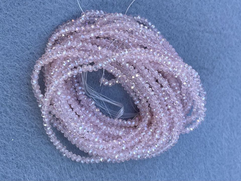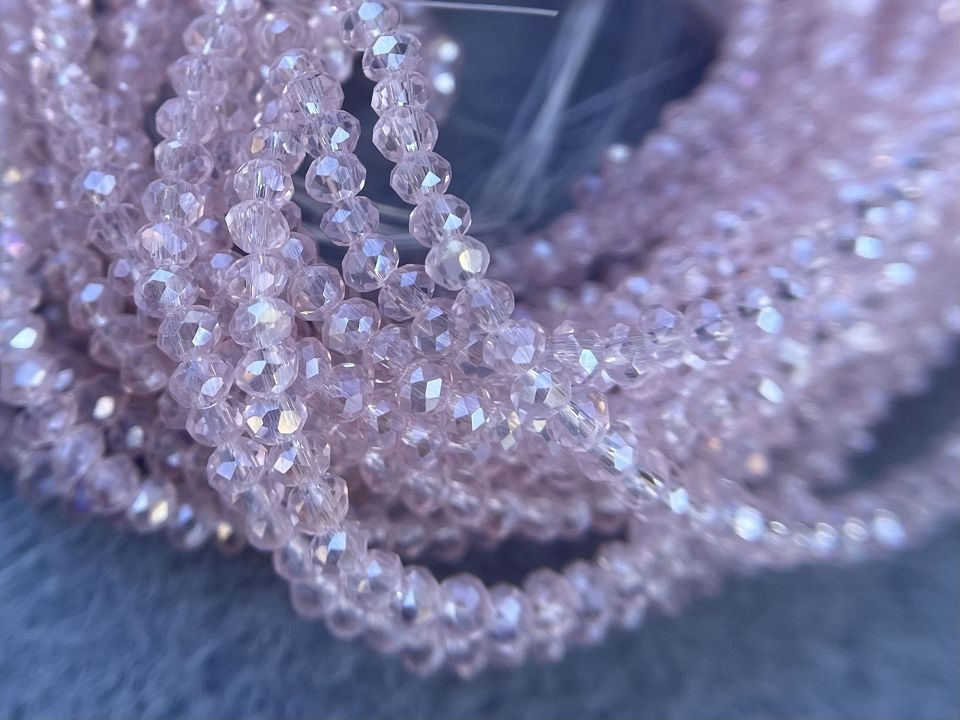 Хрустальные бусины, гранёные. Размер :2*3мм, отверстие : 1 мм. Форма: рондель,сфера . В нитке: 160+-3шт. Цена за 1 нитку. Цвет- светло розовый с переливом.