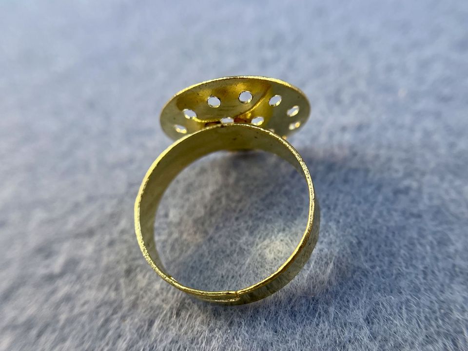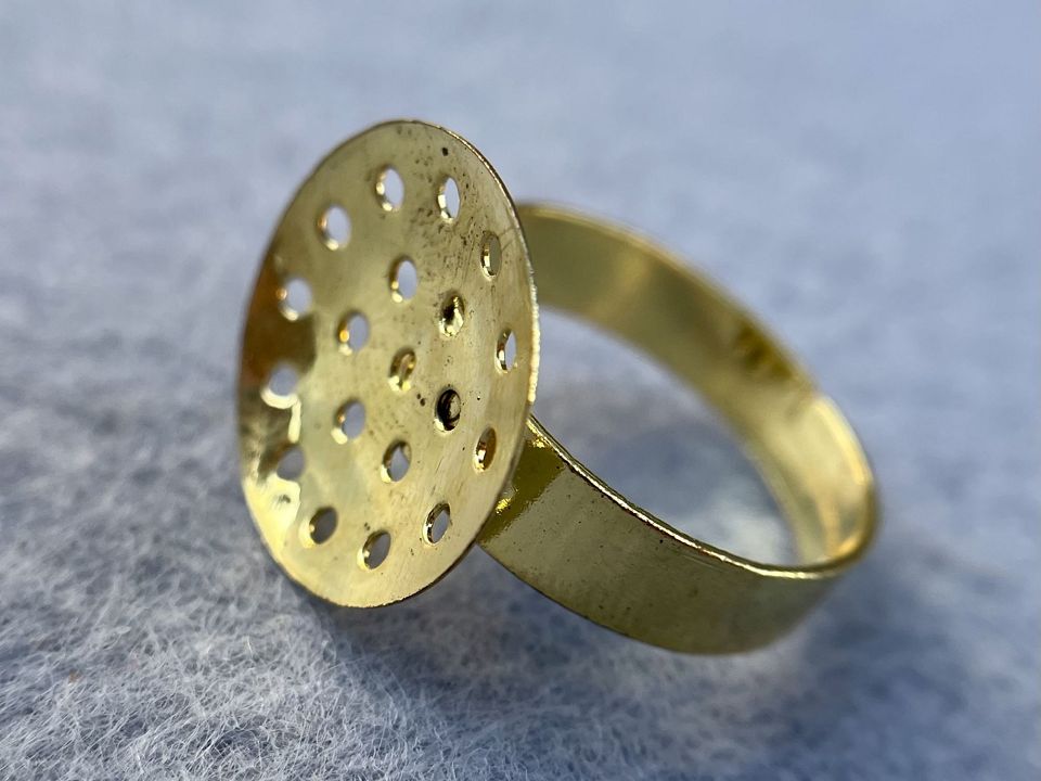 Основа для кольца из металлического сплава, с ситочком. Основа-16мм. Диаметр кольца :17мм и расширяется на пару размеров. Цвет:золото, цена за 1шт.
