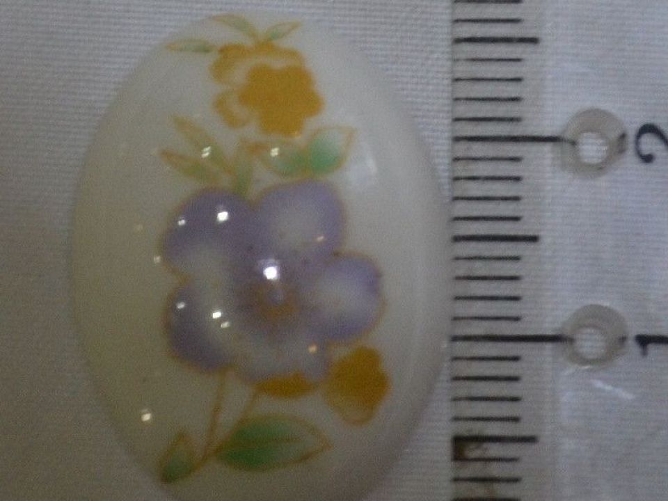 Кабошон фарфоровый с изображением цветов ~ 25*20мм. Форма овальная с плоским основанием. В Понятие "кабошон" входить любой декоративный элемент, что имеет плоскую "подошву" которой он приклеюеться или крепится к основанию. Это может быть декоративный элемент из стекла, пластика в форме круга или овала, цветы из смолы, акрила, полимерной глины. Широко використовуеться изготовлению кулонов, медальонов, брелков, колец, сережек, шпильок, так же подходит для украшения открыток.