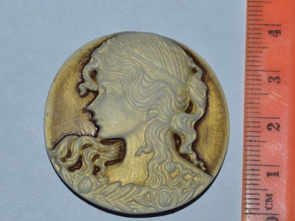 Камея-кабошон пластиковый изображением дева - 35мм. Форма круглая с плоским основанием.