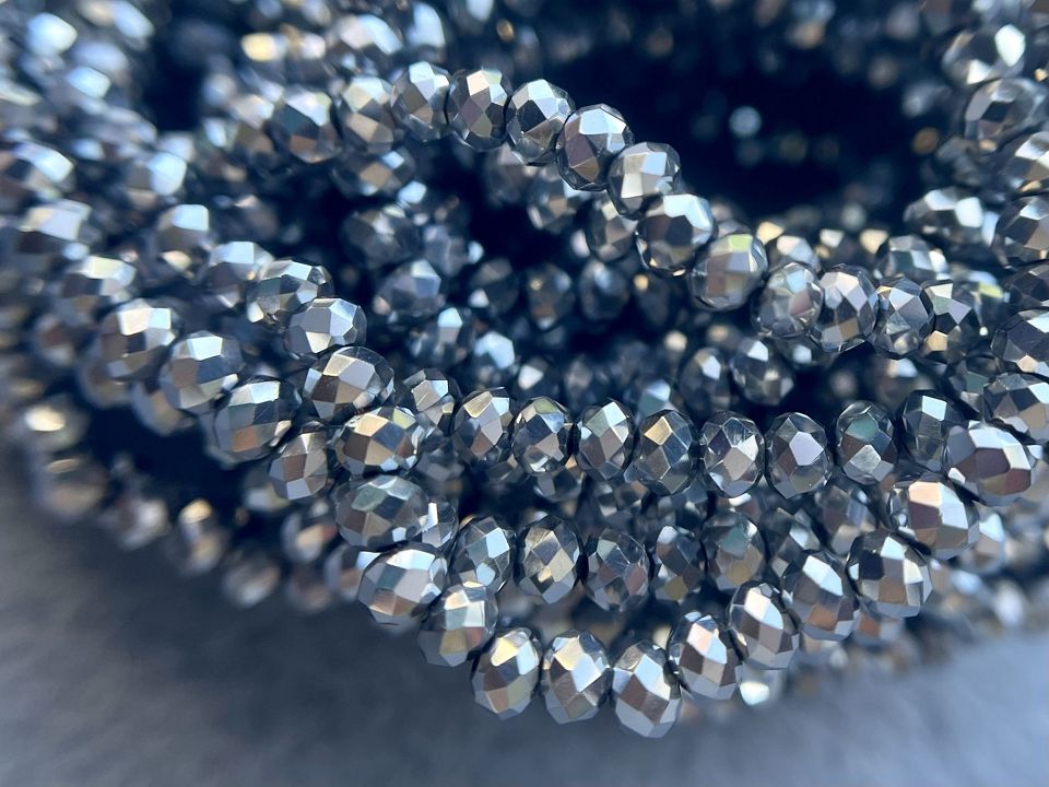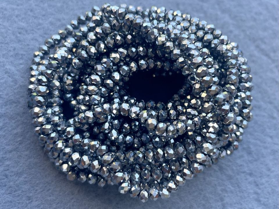 Хрустальные бусины, гранёные. Размер :3*3,5мм, отверстие : 1 мм. Форма: рондель,сфера . В нитке: 145+-5шт. Цена за 1 нитку. Цвет-серебро.
