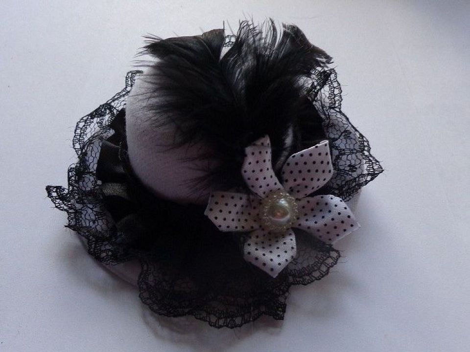 Прикраса для волосся, капелюшок з шпилькою, діаметром приблизно 10 см. прикрашена шовковими квітами, мереживом і пір'ям. Ціна за 1шт.