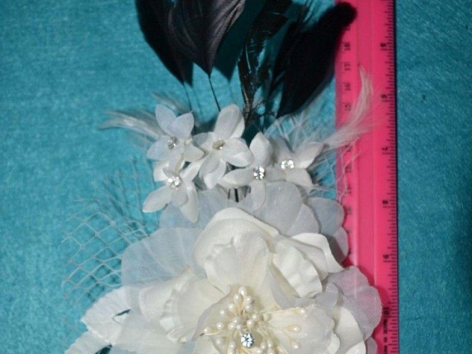 Квітка декоративна 12-14см, з основою 2 в 1-використовується як брошка і шпилька. Прикрашена тичинками, дрібними квіточками і пір'ям. Ціна за 1 шт