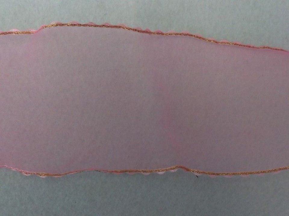 Стрічка з органзи з люрексом, ширина-5 см. В мотку-92 метра. Стрічка йде в мотку без бабіни. Використовуються при будь-яких видах декорування (при виготовленні сувенірів, ляльок, шпильок, гумок, обручів; при упаковці подарунків) .Ленти з органзи вдають із себе тонкі, трохи жорстким і напівпрозорі тканини смужки. Колір-рожевий