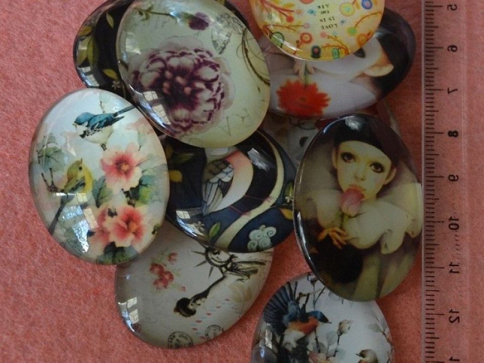 Камея (кабошон) - лінза скляна 35 * 20мм з різними зображеннями, упаковка 10 шт. Форма овальна з плоским підставою. У поняття "кабошон" входить будь-який декоративний елемент, що має плоску "підошву" якої він приклеюється або кріпиться до основи. Це може бути декоративний елемент зі скла у формі кола або сльози, квіти зі смоли, акрилу, полімерної глини. Широко використовується виготовленні кулонів, медальйонів, брелків, кілець, сережок, шпильок, так само підходить для прикраси листівок.