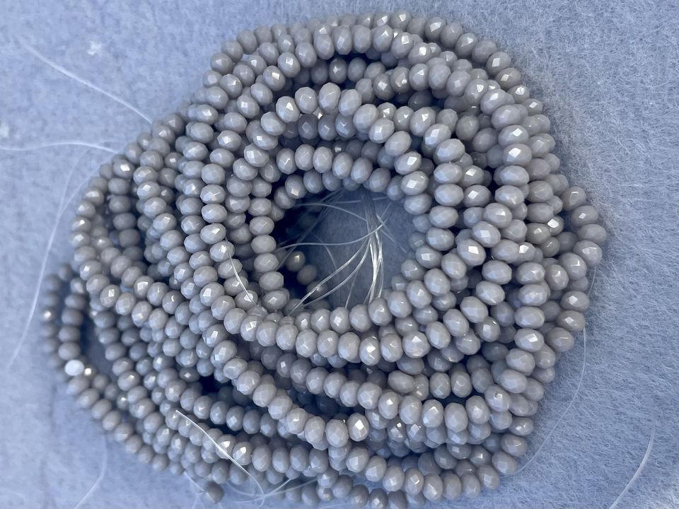 Кришталеві намистини, грановані. Розмір: 3*3,5мм, отвір: 1 мм. Форма: рондель, сфера. У нитці: 145+-5шт. Ціна за 1 нитку. Колір-сіро-бежевий.