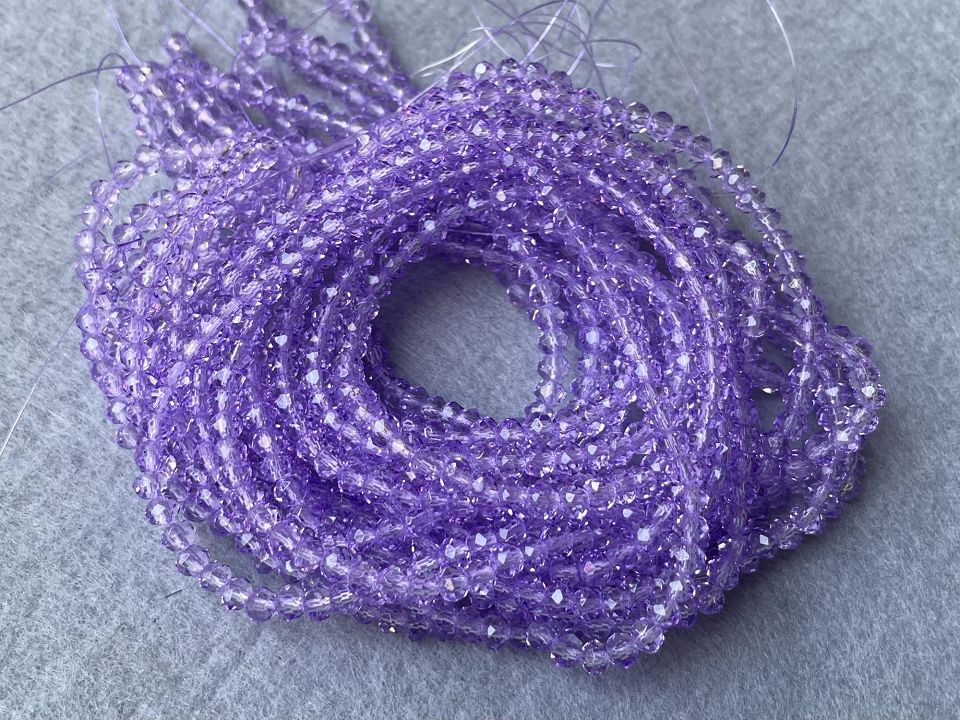 Кришталеві намистини, грановані. Розмір: 4*4,5мм, отвір: 1мм. Форма: рондель, сфера. У нитці: 120+-5шт. Ціна за 1 нитку. Колір-бузково-ліловий.