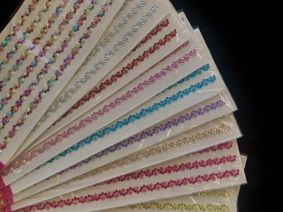 Декоративні стрази самоклеючі для дитячого творчества.Предназначенние для будь-яких твердих поверхностей.В упаковці 6дорожек по 25см, ширина доріжки-1см.Цена за 12 упаковок (різних кольорів)