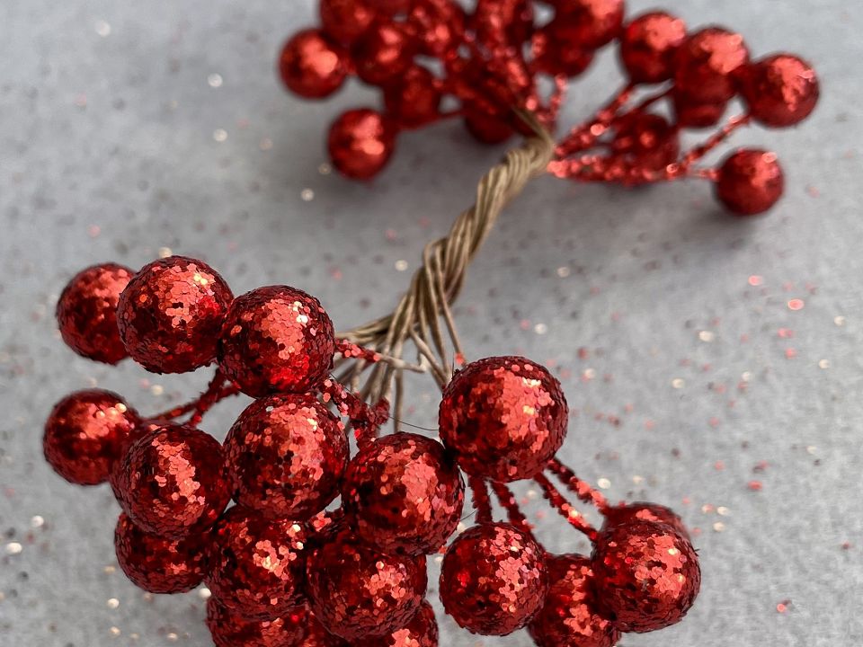 Ягідки зроблені з пінопласту кульки покритого шаром м'якого вінілу і посипані глитер.