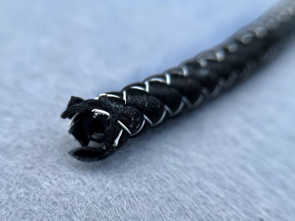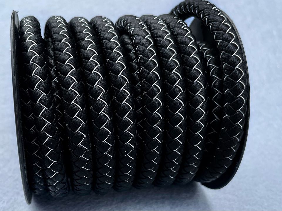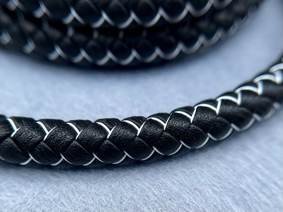 Шкіряний плетений шнур. Діаметр: 8мм. Колір-чорний із білою струною. Плетіння йде на основі, що захищає шнур від розтягування, зберігає його повноту та форму в процесі тривалого використання.