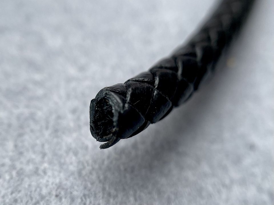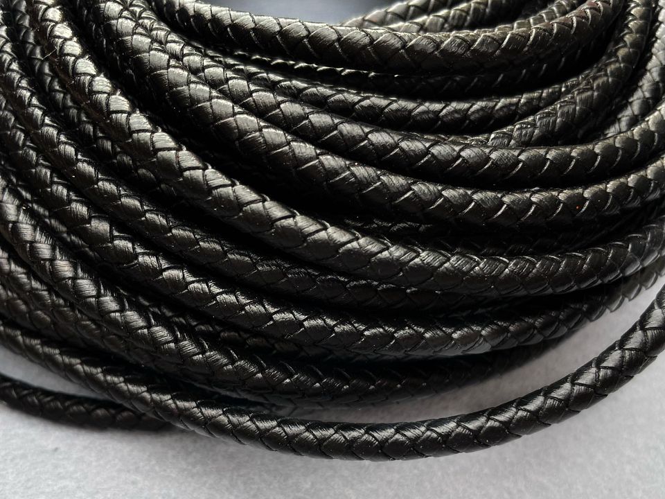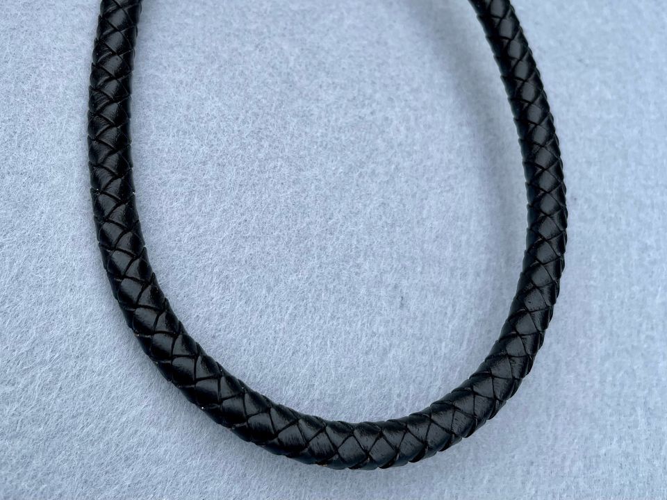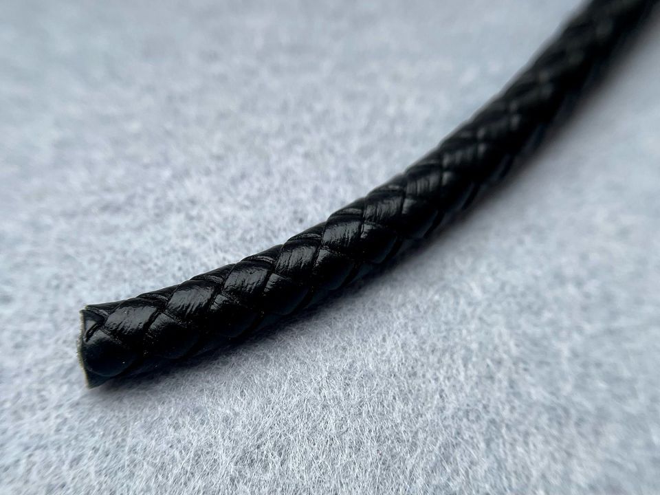 Шкіряний плетений шнур. Діаметр: 6мм. Колір чорний. Плетіння йде на основі, що захищає шнур від розтягування, зберігає його повноту та форму в процесі тривалого використання.