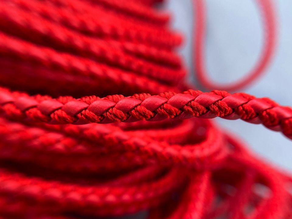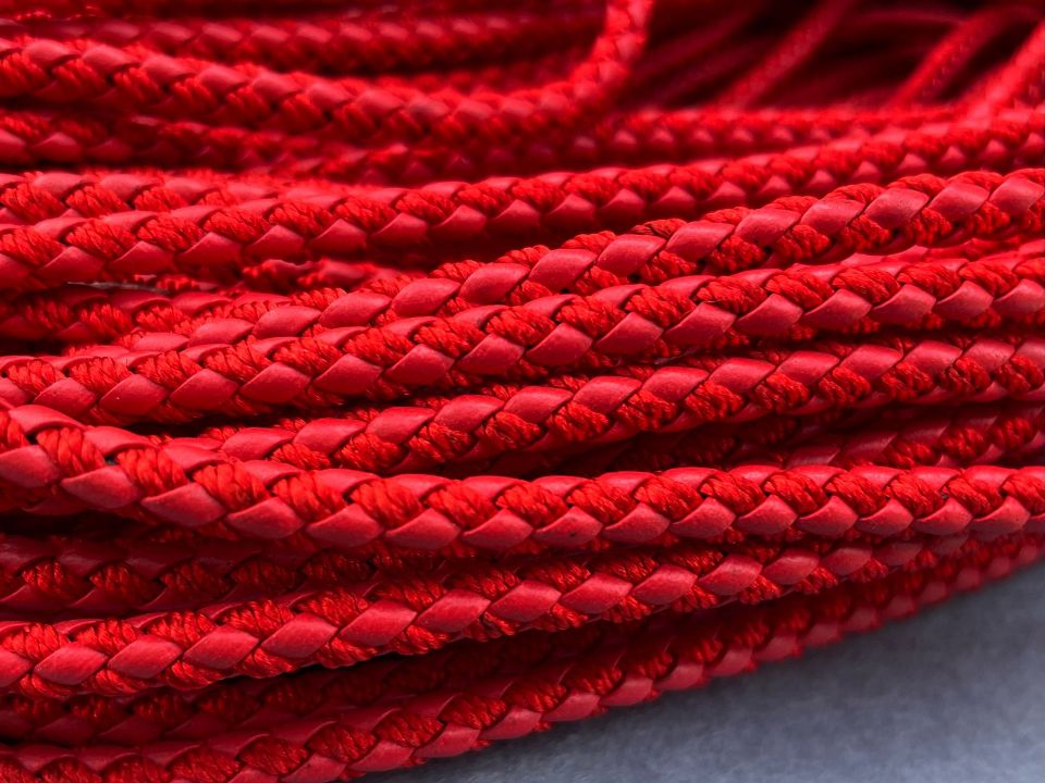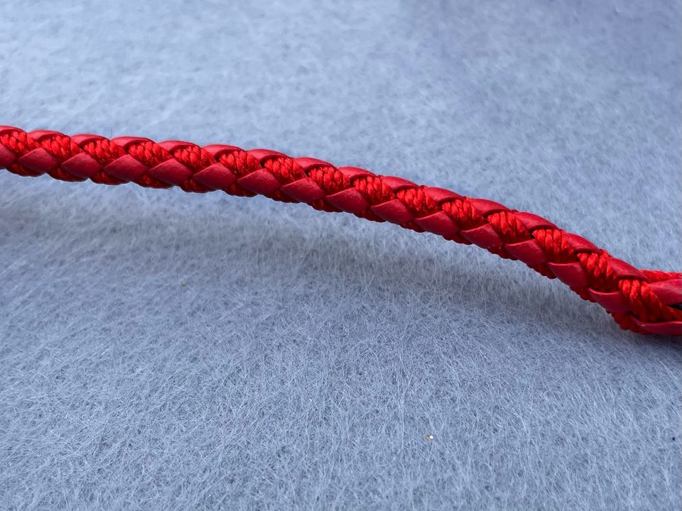 Шкіряний плетений шнур з ниткою. Діаметр: 6мм. Колір червоний. Плетіння йде на основі, що захищає шнур від розтягування, зберігає його повноту та форму в процесі тривалого використання.