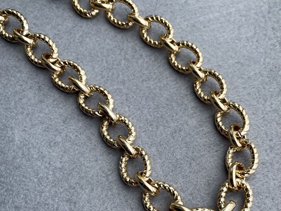 Розмір меншого ланки 1.5 * 1.2см. Велике овальне ланка-2.1 * 1.7см. Колір-рожеве золото. Ланцюг велика використовують як декоративний елемент (в залежності від розміру ланцюга) при пошитті: сумок, рюкзаків, косметичок, брелків, взуття, одягу, елемент декору інтер'єру, при створенні біжутерії та інше.
