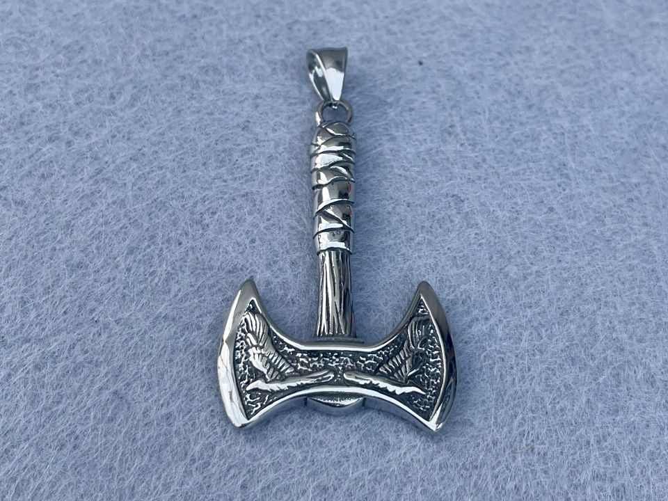 Кулон із нержавіючої сталі. Підвіска-амулет у скандинавському стилі "Сокира Вікінга". Кулон двосторонній. Колір-сталь. Розмір: 3*6см. Розмір отвору: 5*7 мм Ціна за шт.