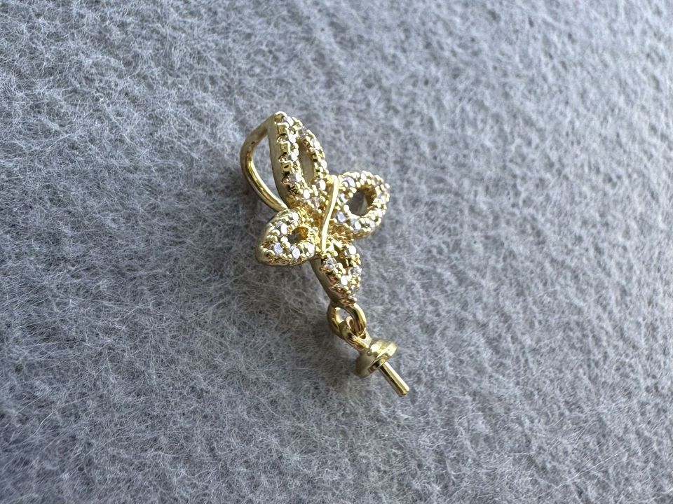 Підвіска інкрустована кубічним цирконієм зі штифтом для приклеювання перлин. Покриття родій Розмір: 17*19 мм + штифт 8 мм. Штифт: 3,5 мм, діаметр: 1 мм. Колір – золото, ціна за 1 шт.