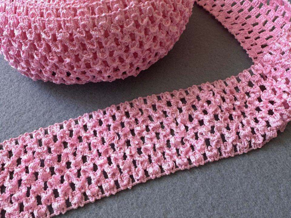 Ажурна гумка дитяча. Ширина 6 см. Ціна за моток – 25 метрів. Використовується для дитячих пов'язок на голову та одяг. Колір - рожевий.