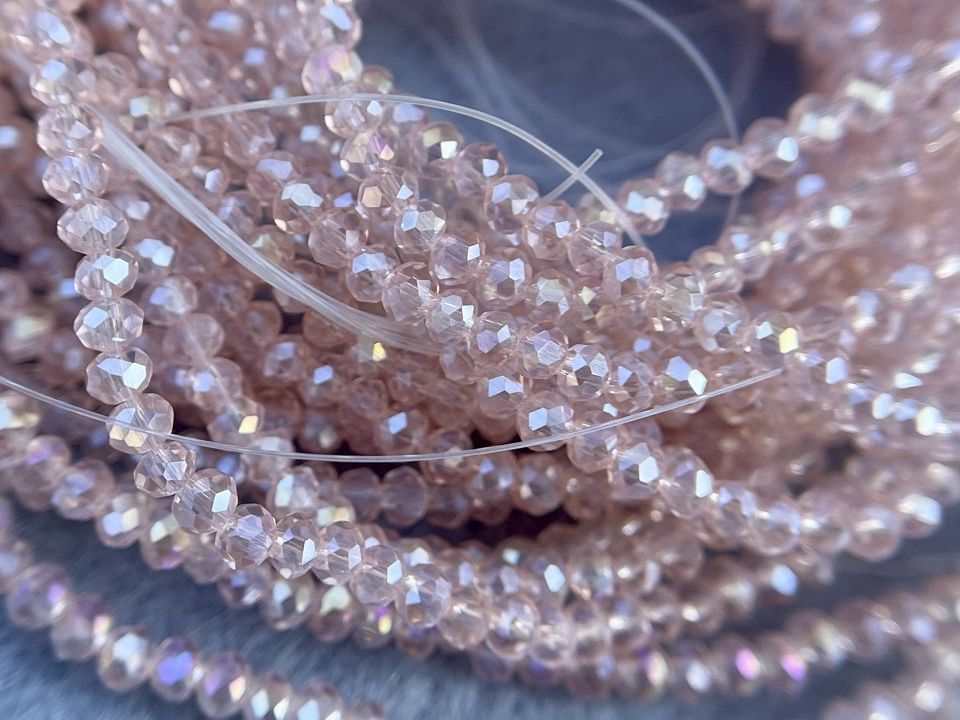 Кришталеві намистини, грановані. Розмір: 2*3мм, отвір: 1 мм. Форма: рондель, сфера. У нитці: 160+-3шт. Ціна за 1 нитку. Колір-персиковий з переливом.