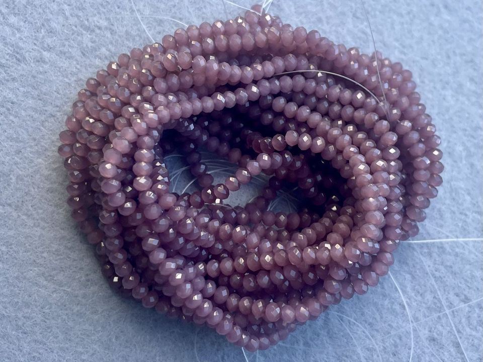 Кришталеві намистини, грановані. Розмір: 3*3,5мм, отвір: 1 мм. Форма: рондель, сфера. У нитці: 145+-5шт. Ціна за 1 нитку. Колір-фрезовий напівпрозорий.
