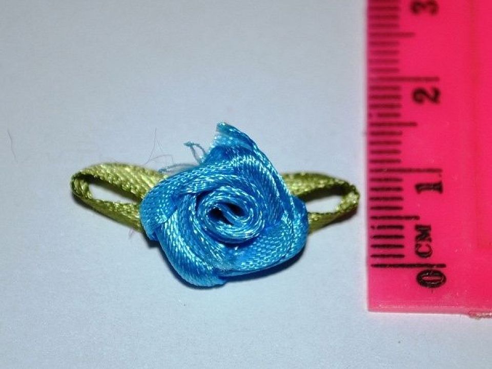 Атласна трояндочка з листочками Розмір: трояндочка - 15 мм, з листочками - 25 мм Колір блакитний Упаковка 50 шт