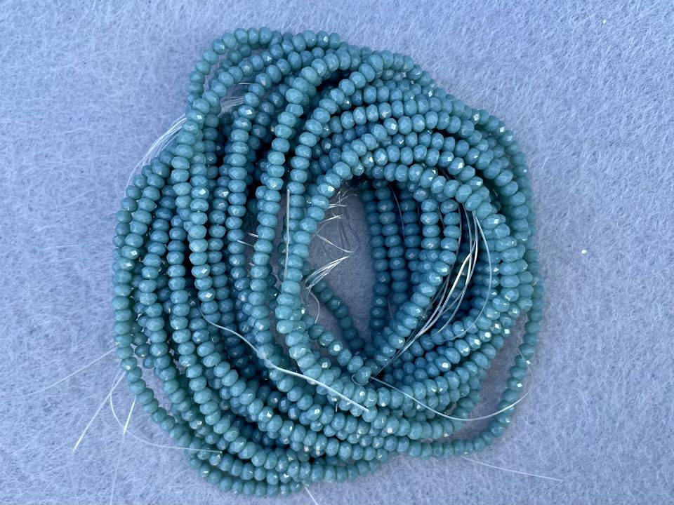 Кришталеві намистини, грановані. Розмір: 2*3мм, отвір: 1 мм. Форма: рондель, сфера. У нитці: 160+-3шт. Ціна за 1 нитку. Колір-сіро-синій-напівпрозорий.