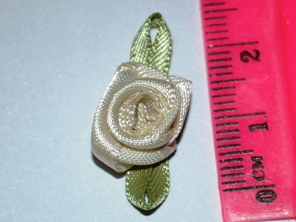 Атласная розочка с листиками Размер: розочка - 15 мм, с листиками - 25 мм Цвет: молочный Упаковка 50 шт