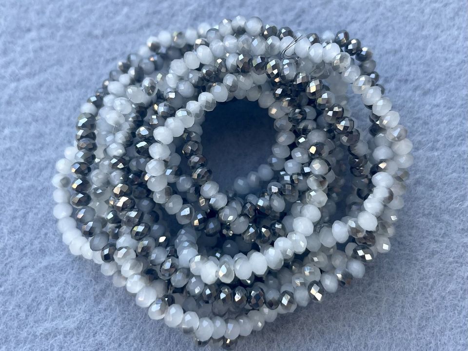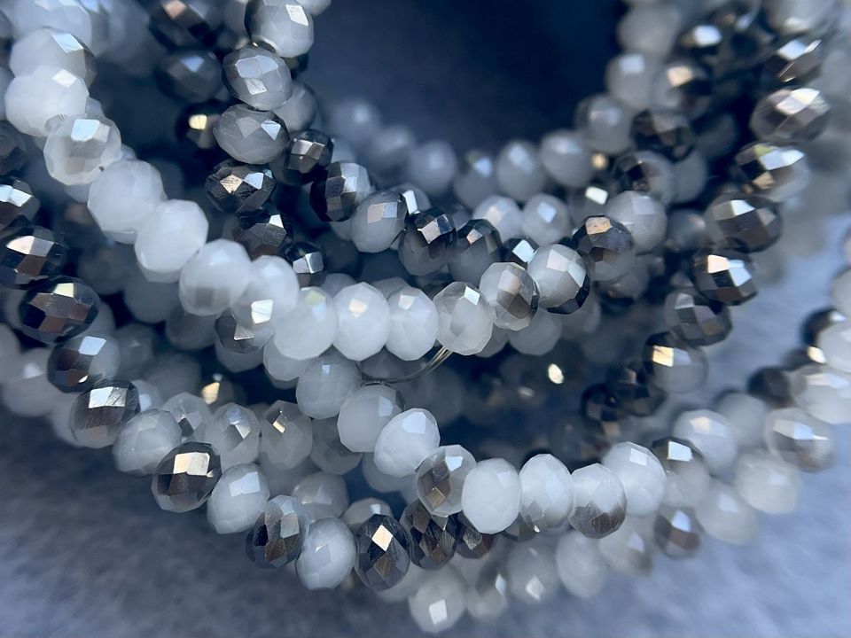 Хрустальные бусины, гранёные. Размер :3*3,5мм, отверстие : 1 мм. Форма: рондель,сфера . В нитке: 145+-5шт. Цена за 1 нитку. Цвет-серо-серебристый.